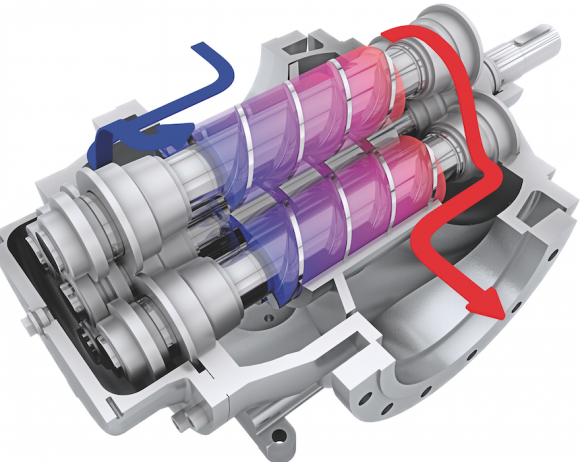 在驅(qū)動(dòng)螺釘?shù)男D(zhuǎn)過程中,由于這些螺釘之間的嚙合,從動(dòng)螺釘也隨之旋轉(zhuǎn)。在入口部分,由于這些螺釘?shù)囊苿?dòng),開始產(chǎn)生輕微的真空。由于這種真空,流體從入口閥被吸入泵中。進(jìn)入泵后,流體被困在“螺釘”的間隙之間。隨著螺桿的旋轉(zhuǎn),這些被困流體也會(huì)移動(dòng)。螺桿運(yùn)動(dòng)導(dǎo)致截留的流體體積減少,同時(shí)流體壓力增加。