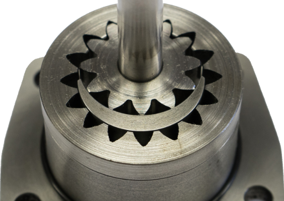 內(nèi)嚙合齒輪泵有多種類型,但基本相同。“齒輪中的齒輪”設(shè)計是相對較新的發(fā)展。優(yōu)點是機(jī)械軸的支撐軸承較少,齒較大但較少,因此特別適用于非常粘稠的流體。盡管它們采用懸臂式設(shè)計并且不太能夠處理非常高的壓力,但它們在化學(xué)品、瀝青、樹脂等領(lǐng)域變得非常流行,主要是因為它們易于維護(hù)和多功能性。與具有工廠預(yù)設(shè)間隙的外齒輪泵相比,一個很大的優(yōu)勢是可以調(diào)整泵的端部間隙,從而延長泵的使用壽命和多功能性。下面顯示的設(shè)計具有簡單的直齒。